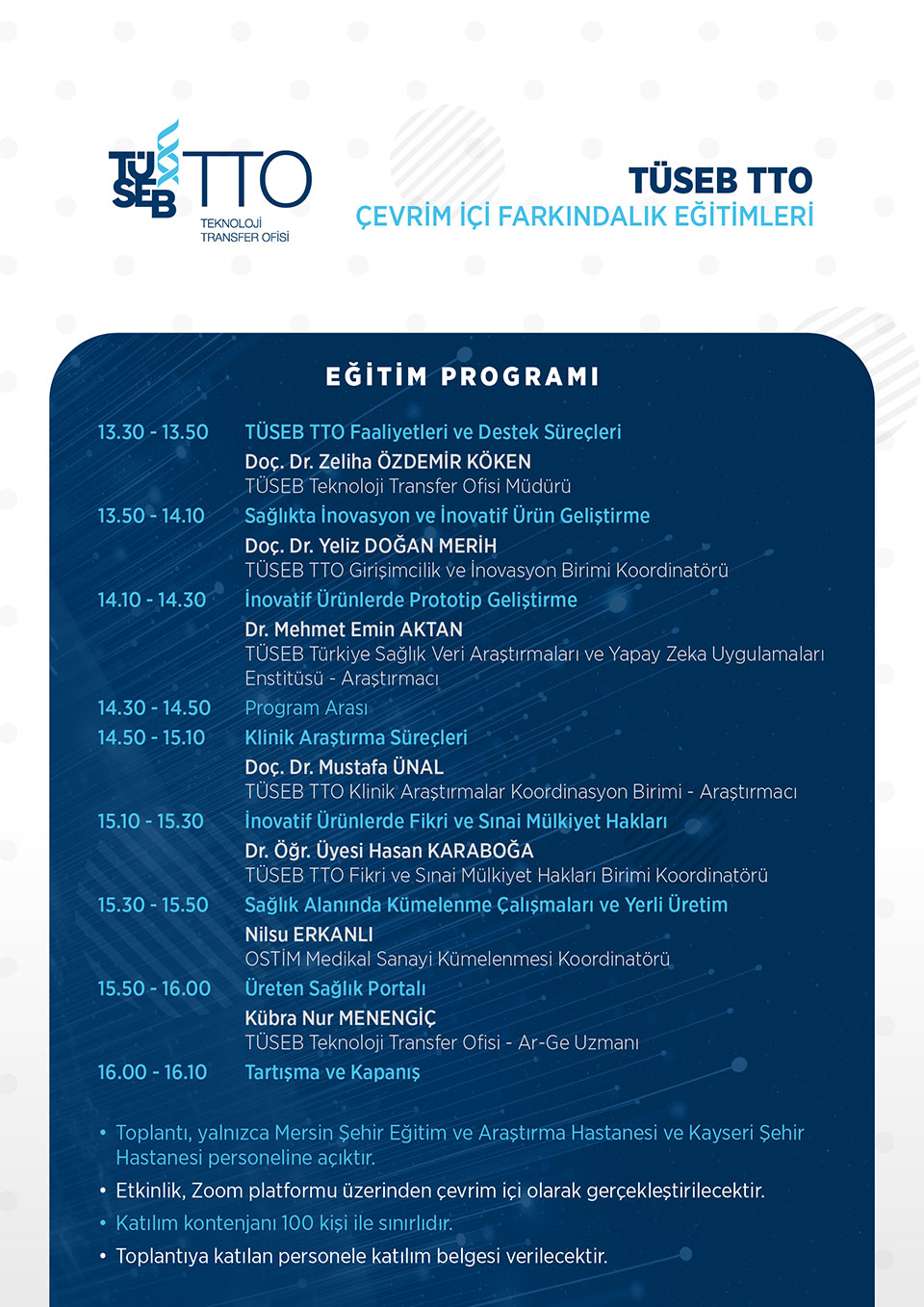 Eğitimler, TÜSEB Teknoloji Transfer Ofisi’nin faaliyetleri ve destek süreçlerinin yanı sıra; fikri haklar, girişimcilik, klinik araştırmalar, yerli üretim, inovasyon ve prototip geliştirme gibi sağlık ve teknoloji kesişimindeki başlıklara odaklanıyor.